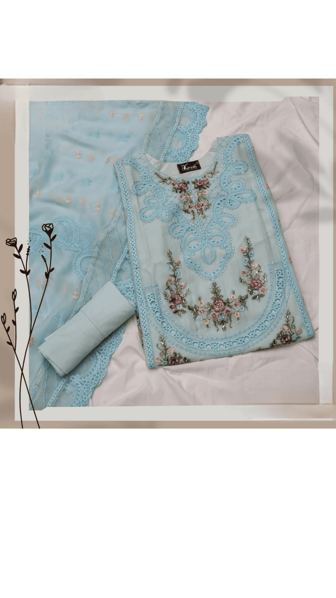 Elegant Embroidered Suit - Casual Womenswear Floral Embroidery: This suit features intricate floral embroidery, adding a touch of elegance to your casual wardrobe. Sheer Sleeves: The sheer sleeves provide a delicate and stylish look, perfect for casual outings. Casual Womenswear: Designed for comfort and style, this suit is ideal for casual wear. Key Features Color: The suit comes in a beautiful pink, blue color, making it a versatile addition to your closet. Embroidered Detailing: The floral embroidery adds a unique and eye-catching detail to the suit. Casual Style: This suit is perfect for casual occasions, offering both style and comfort. Perfect for Casual Outings: Ideal for casual outings, this suit will keep you looking stylish and comfortable. Fastive Wear: Perfect for fastive wear, this suit is a must-have for your casual wardrobe.